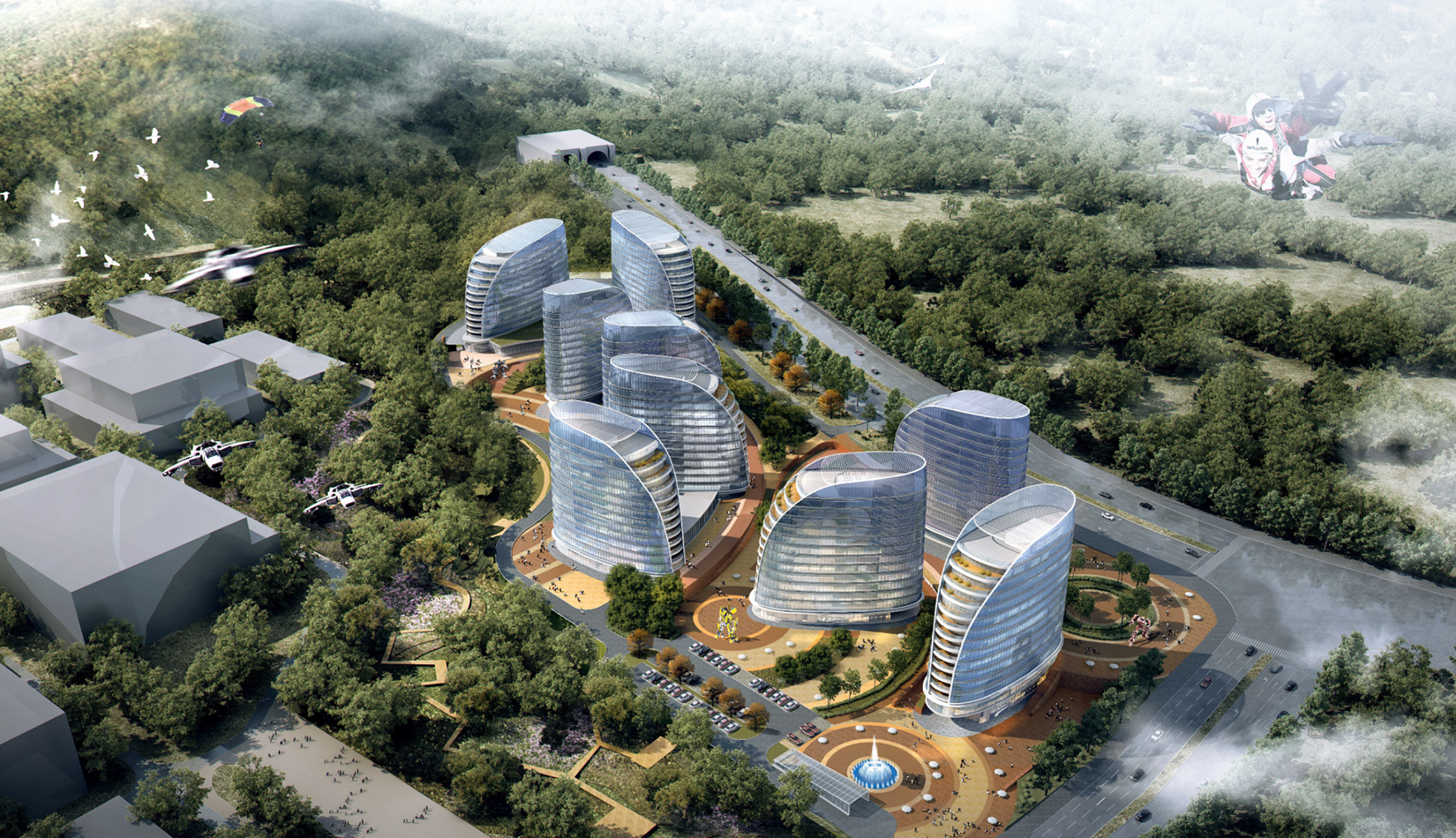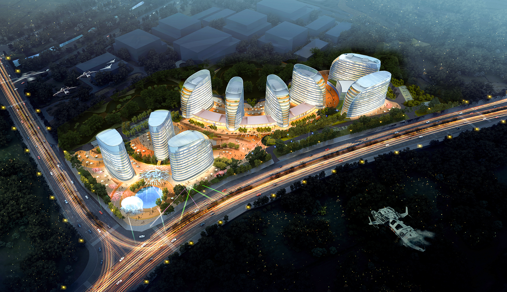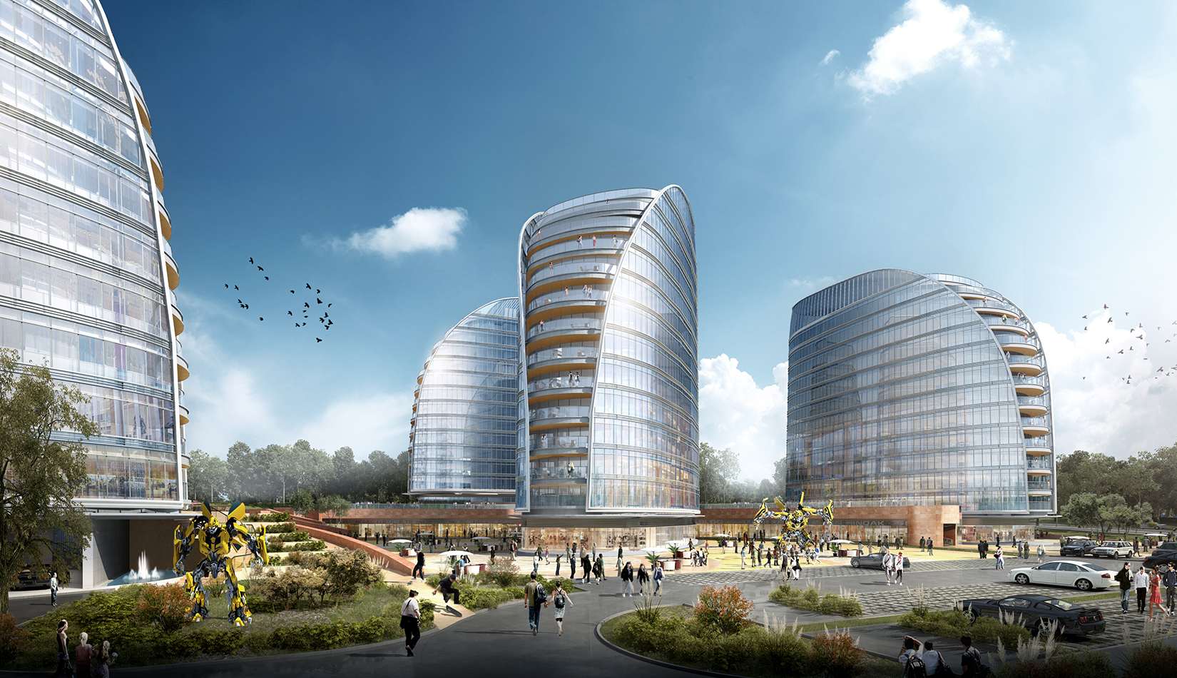 注重地塊內(nèi)空間環(huán)境的滲透和景觀視線效果,保持地塊環(huán)境與城市環(huán)境的共融性,提升城市空間價(jià)值。建筑外觀采用簡潔、現(xiàn)代的風(fēng)格,立面形象富有視覺沖擊力,樹立企業(yè)品牌與形象。高層建筑層層平臺(tái)向景觀蔓延,為人們提供豐富多變的生活工作空間。底層平臺(tái)上的文化內(nèi)街,結(jié)合影視特色主題,聚集人氣,串聯(lián)互動(dòng)。曲線連廊內(nèi)部空間流動(dòng),成為具有活力的公共交往場(chǎng)所。