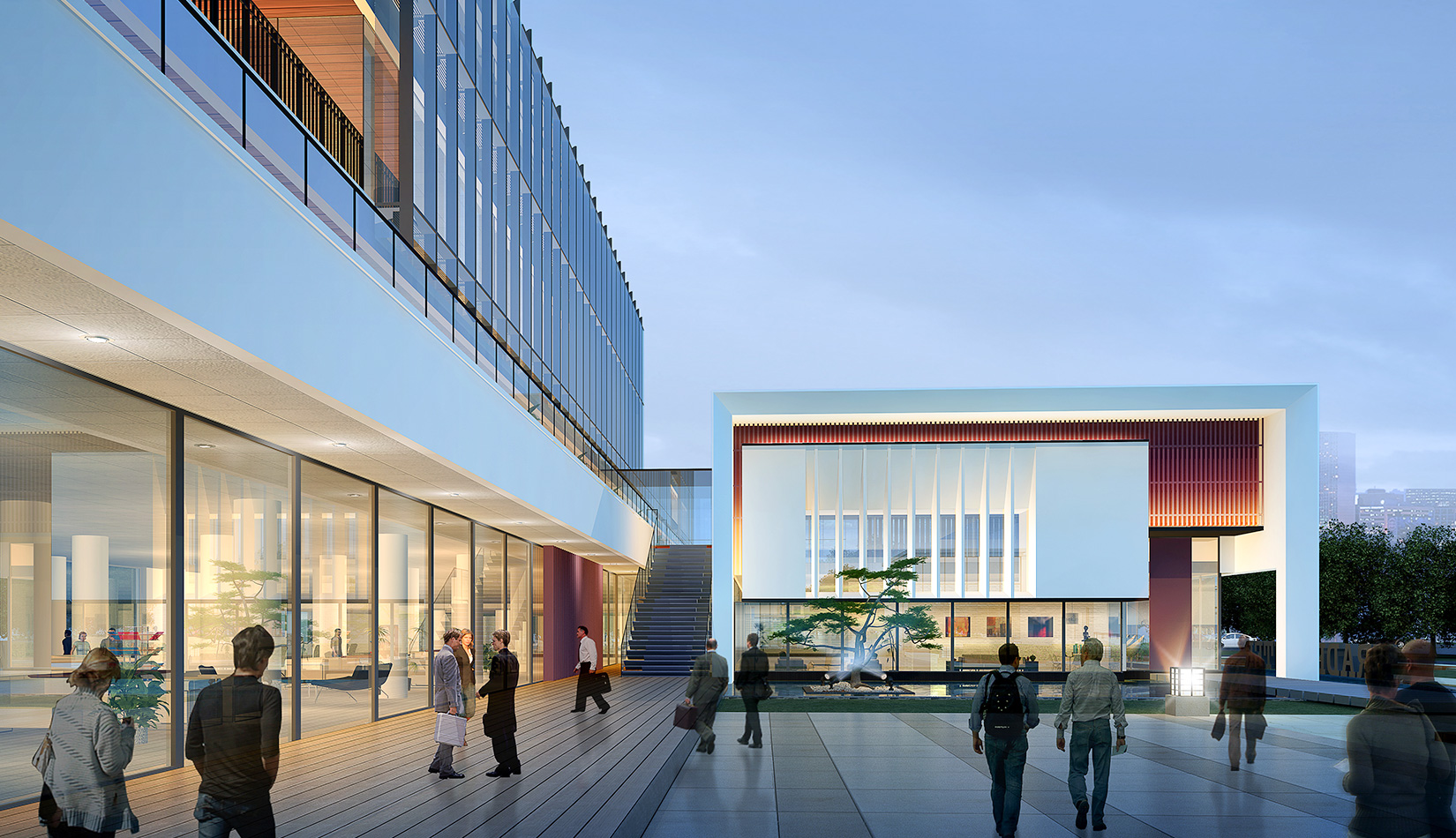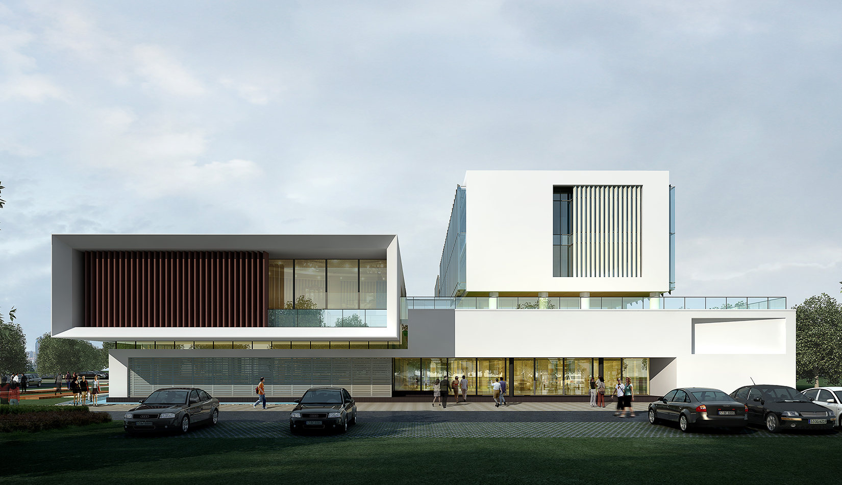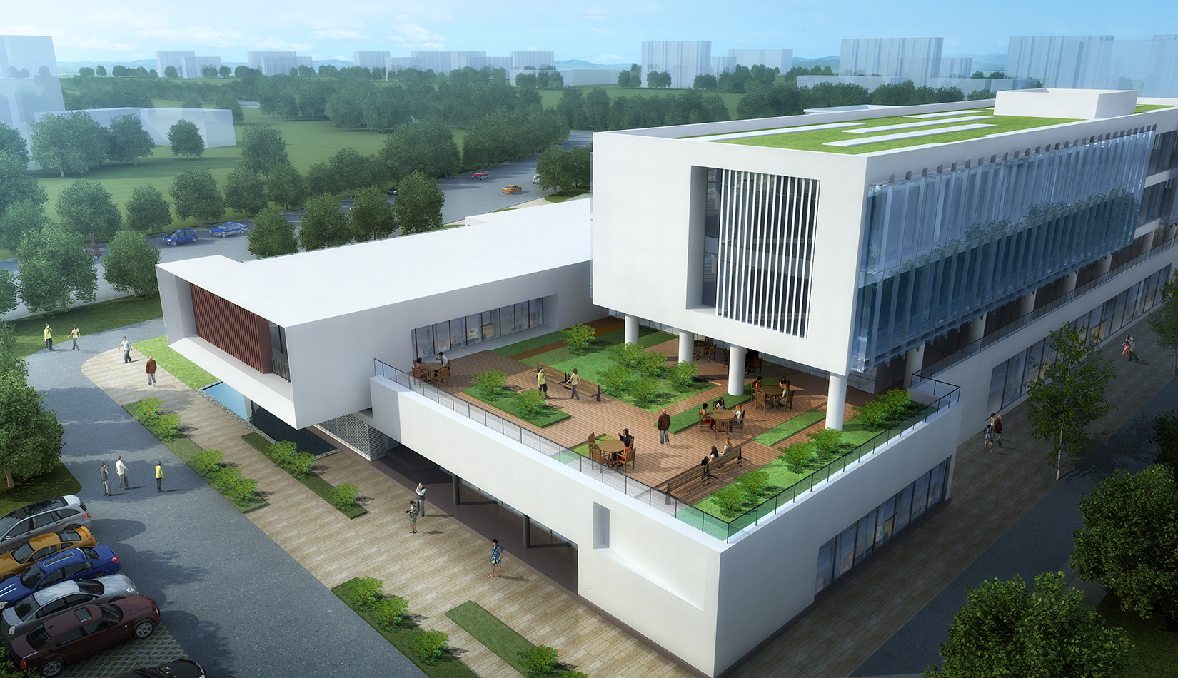 作為中韓貿(mào)易合作區(qū)一期啟動(dòng)區(qū)的重點(diǎn)項(xiàng)目,其承擔(dān)著對(duì)外展示以及為后續(xù)發(fā)展提供服務(wù)平臺(tái)的功能。因此設(shè)計(jì)力求穩(wěn)重大氣,以4 層的體量打造出地標(biāo)性的建筑。設(shè)計(jì)運(yùn)用簡(jiǎn)潔的外形、寧?kù)o的色彩,外立面以白色涂料和木格柵為主,尊重自然,打造一種平和寧?kù)o的感覺(jué)。在空間設(shè)計(jì)上通過(guò)共享空間、上人露臺(tái)和一層大平臺(tái),創(chuàng)造出舒適宜人的工作環(huán)境;在技術(shù)上通過(guò)地源熱泵、呼吸式幕墻、雨水收集等的應(yīng)用,實(shí)現(xiàn)建筑的綠色節(jié)能環(huán)保。