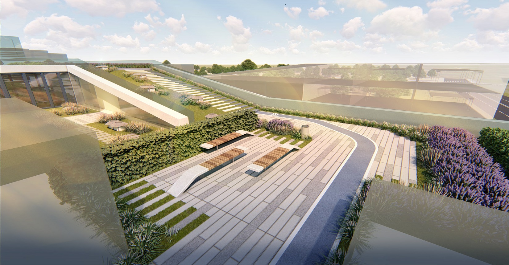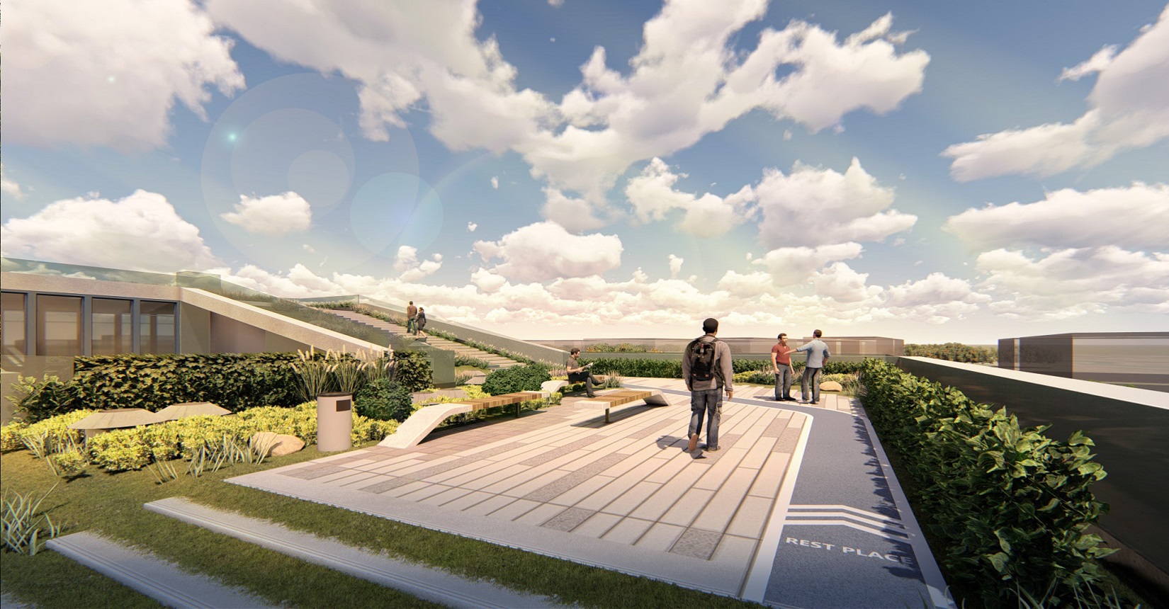 強調室內空間和室外空間的融合,利用屋面打造慢行系統(tǒng),使建筑成為公園的組成部分,將公園景觀引入建筑當中,打造具有標志性的城市客廳、一個戶外生態(tài)客廳、原生態(tài)的生活空間,鼓勵面對面的交流,員工之間的交流,員工與客戶的交流,鄰里之間的交流。使用一條流動的能量線環(huán)形慢跑道,串聯(lián)整個空間傳達先進、高能量與流動的整體形象。